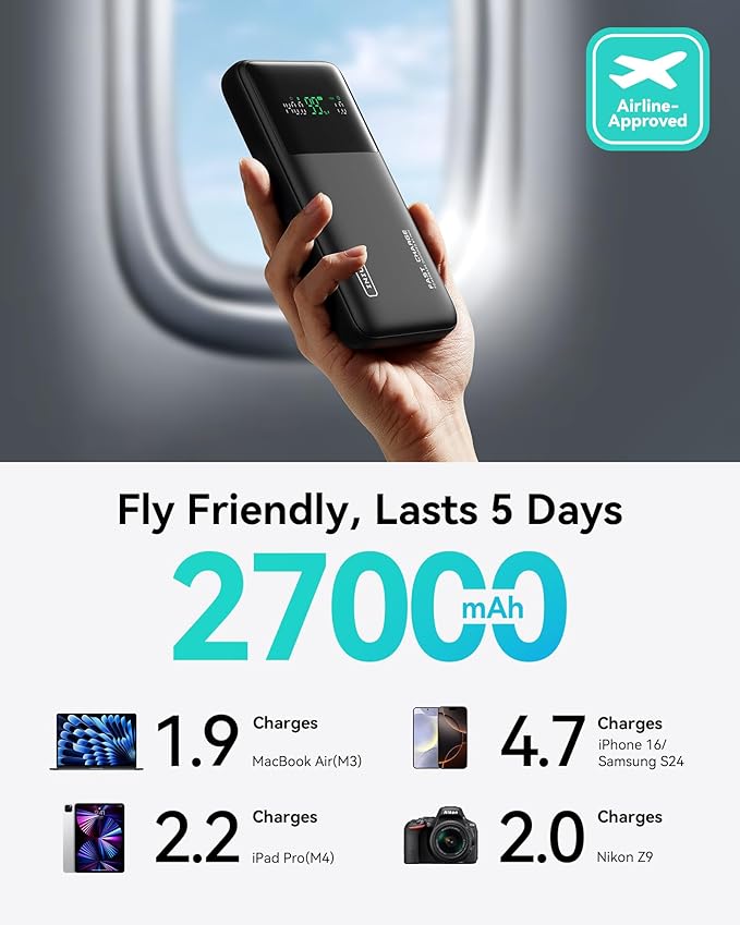 - Massive Airline-Approved 27,000mAh: With a whopping airline-approved 27,000mAh battery capacity, it gets multiple charges for all your devices on the go in recharge once.