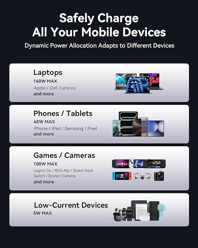 - 140W PD 3.1 Super-Fast Charging: While others struggle at 65W or even 100W, our 140W PD 3.1 PowerNova if fast enough to power up all high-power-demand devices like the laptops and SteamDeck. In just 30 minutes, you'll have a MacBook Pro 16" at 59%, SteamDeck at 57%, iPad Pro M2 at 64%, iPhone 15 Pro Max at 71%, and S23 Ultra at 75%.