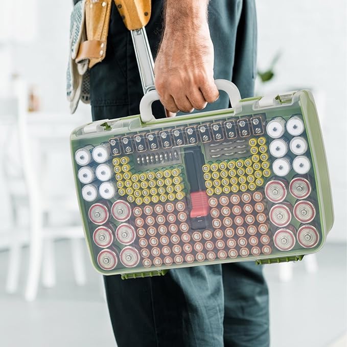- Hard garage organizer box: Battery organizer storage case with battery tester made of premium plastic, is splash-proof and shock-proof. Thickened hinges hinder battery tool organizers and storage from breaking during use. The battery case organizer keeps drawers clean and tidy, and keeps batteries organized in the same place. Battery box avoids batteries touching each other, which will drain the power and stave off the fire caused by the burning of battery storage case