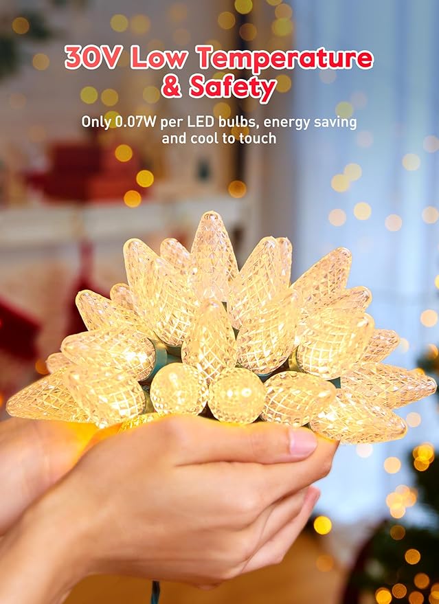 - Special Feature : 8 Lighting Modes, LED C9 Strawberry-Shaped Bulbs, Christmas Tree Decorations, Memory Function, Timer Function: 6H on & 18H Off, UL certified, Waterproof, Connectable 8 Lighting Modes, LED C9 Strawberry-Shaped Bulbs, Christmas Tree Decorations, Memory Function, Timer Function: 6H on & 18H Off, UL certified, Waterproof, Connectable
