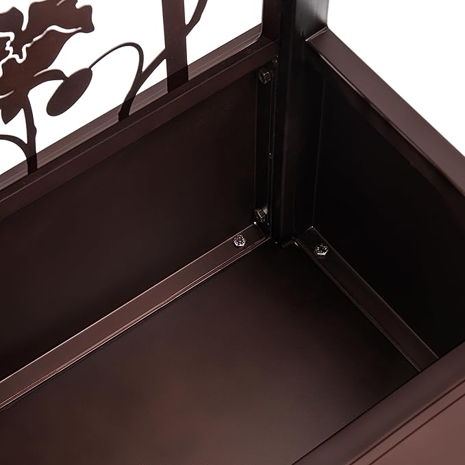- Heavy and requires assembly - Trellis planter for indoor outdoor - This garden planter with trellis can be used with climbing plants on your deck, patio, or balcony. Use outdoors or indoors, this privacy screen with trellis has a mahogany tone powder-coated finish, blends with any decor. This flower box with trellis features precision, laser cut, 16-gauge steel and can be used in residential or commercial venues.