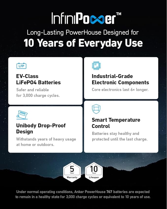- Long-Lasting 10-Year Lifespan: Anker SOLIX F2000 is built to last over a decade, even with everyday use. Our long-lasting InfiniPower technology combines LiFePO4 batteries, durable electronics, and temperature monitoring up to 100 times per second, ensuring battery health.