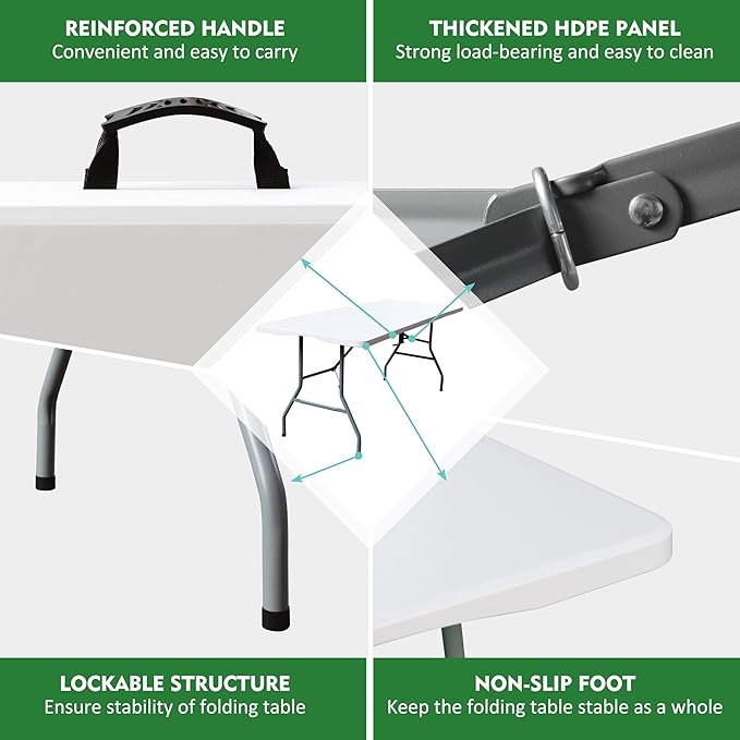- STURDY AND DURABLE: Our folding table features a sturdy steel frame and non-slip rubber feet for strong support and a weight capacity of up to 300 lbs. Powder-coated legs ensure long-lasting durability, making the table perfect for any outdoor environment.