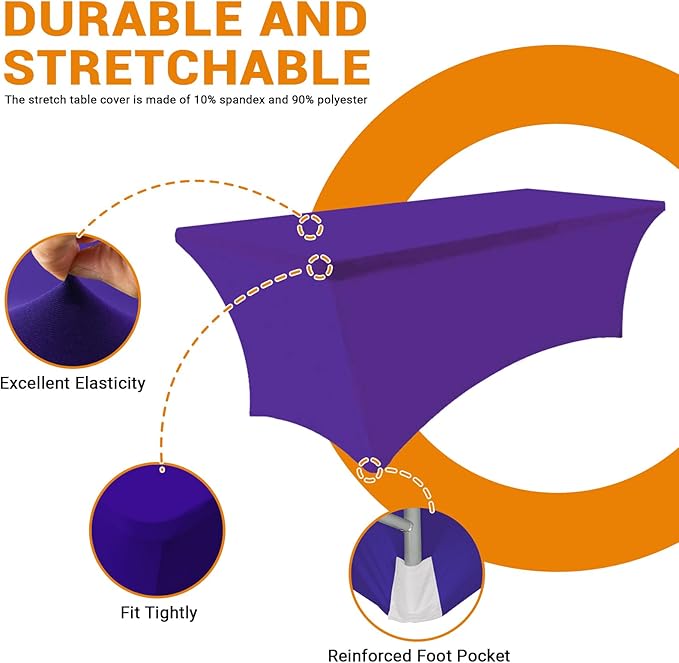 - DESIGN: The fitted 8 feet tablecloth is always fitted and tight. The 4 Way stretchable spandex table covers are designed with reinforced foot pockets for the table legs to make a tight and professional look, and your table cover won't slip around or billow with wind again by this special design.The 6 foot tablecloth fits tables that are 96"L X 30"W X 30"H.