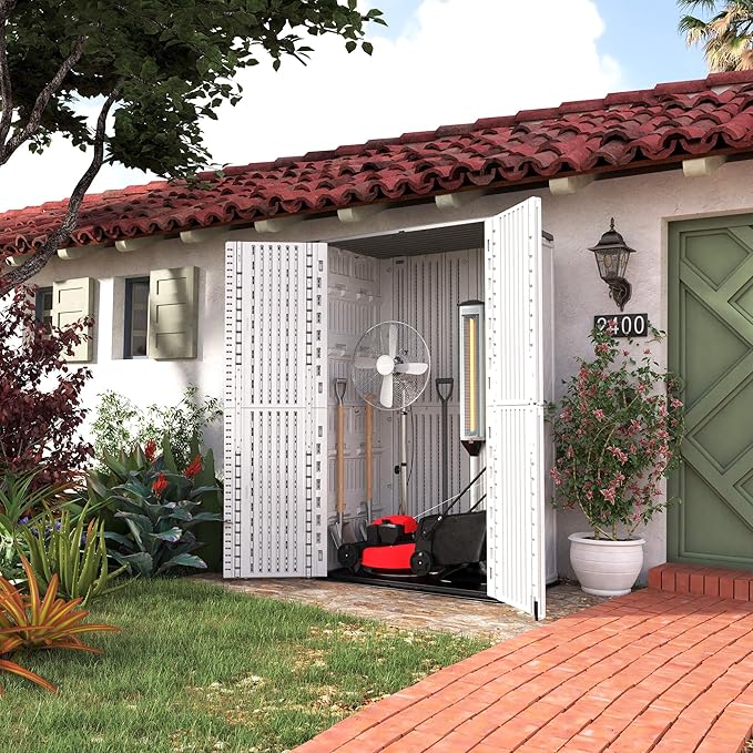 - 【Stylish Decor】 The simple and stylish design makes this plastic storage shed very popular. Not only does it ensure practicality, but it also ensures beauty. Wherever used in outside or inside, it could be a stylish decor. Add more fun and beauty in life.