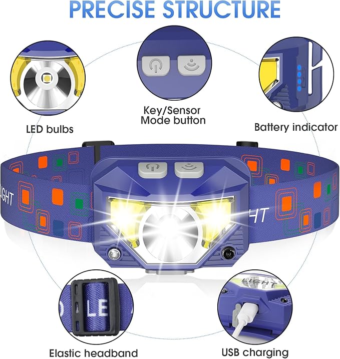 - Waterproof and 8 Modes: The headlight has IPX4 waterproof rate. The high-quality shell is more sealed and leak-proof, which is suitable for rain or snow, indoors or outdoors. The led headlamp has 8 lighting modes to meet your various needs. In key light mode, you can switch the main strong beam, main weak beam, side strong beam, side weak beam, red beam, SOS red strobe. In motion sensor mode, you can switch the main strong beam and side strong beam