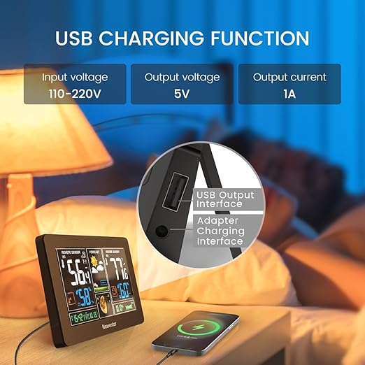 - [7.5" LCD Screen Weather Stations] Newentor temperature&humidity monitor with large color display, which shows comprehensive information: inside outside temperature humidity(max/min, hi/lo), customizable alerts, time/date, alarm clock/snooze, weather forecast (next 8-24 hrs) moon phase, barometric pressure.