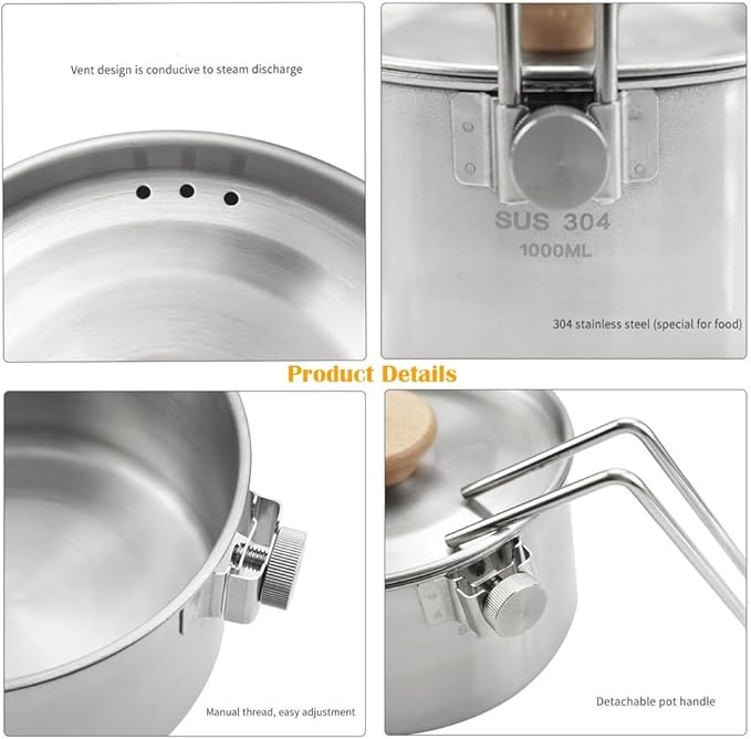 BSGB Camping Pot with Lid Fork Knife Spoon Bag and Detachable Handle 1L/34oz 304 Stainless Steel Pot Travel Coffee Pot Camping Tea Kettle Cookware Hiking Picnic Backpacking Survival