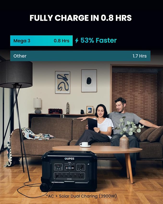 - 【Fast Charging】Fully recharge the Mega 3 in 1.8 hrs with 2000W wall outlets, or 2100W solar charged in 2.5 hrs, thanks to the industry-leading solar conversion efficiency of up to 23%. Ideal for juicing up the battery between short outages.