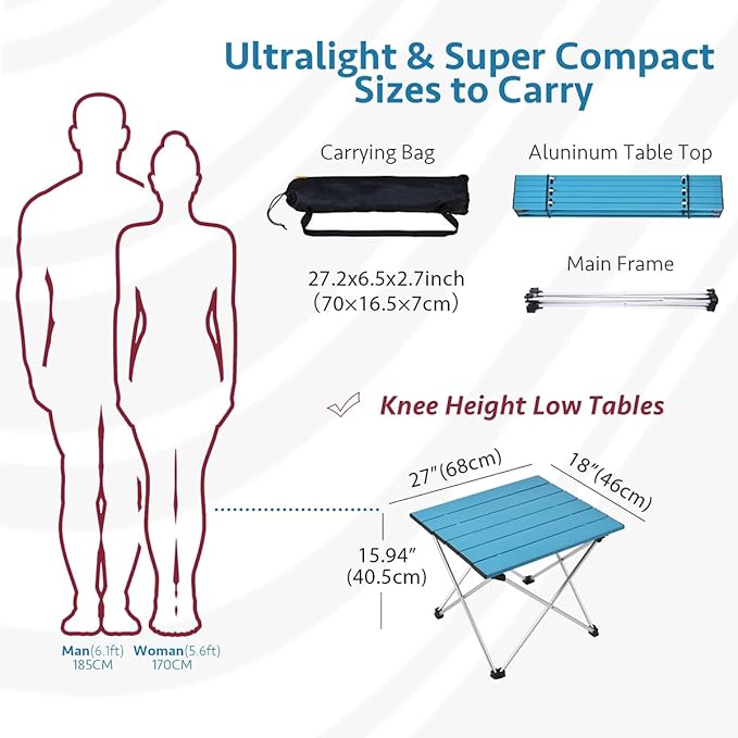 - User-friendly Design ---- Suitable table height for all most camping chairs or stools. Our folding camp table is easy to install, just unfold the aluminum frame, press the two rails into the grooves first, then press the table top into the grooves, and you have a sturdy traveling table. Perfect for drinking coffee at home, as a beach table, or picnic table for cooking and dining.