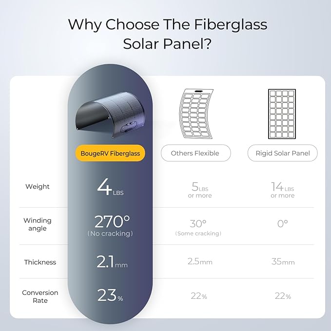 - Even a Child Can Carry and Move Ultra Lightweight-Only 4 lbs and Thin-Only 2mm. The BougeRV factory uses special lamination technology to make fiberglass flexible solar panels light and thin, leading in the market, and easy to move.