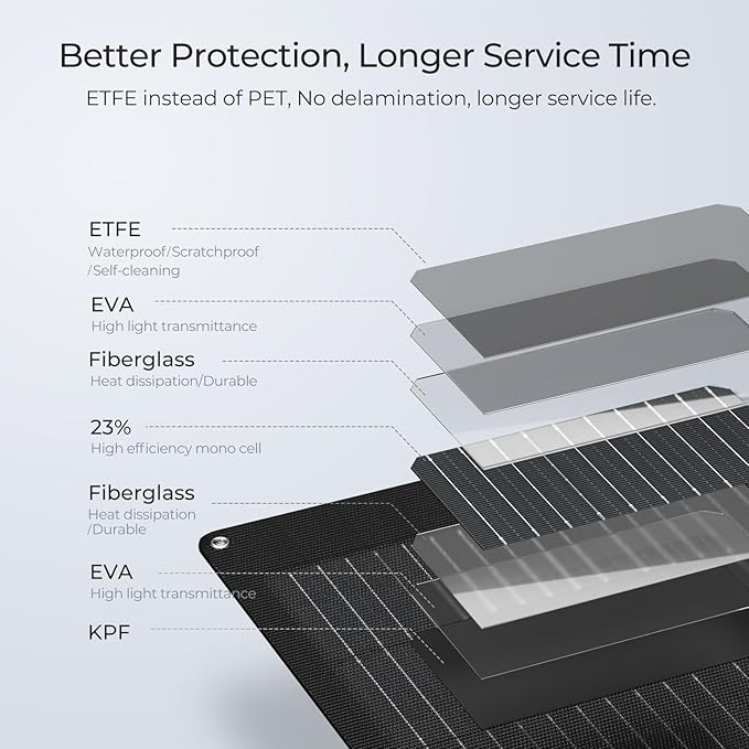 - ETFE Covering Material. Using ETFE instead of PET, will not delaminate after long-term use, so it has a longer service life. It has anti-scratch/self-cleaning/sand-proof capabilities and can resist impact and abrasion, preventing collisions and possible wear, scratches, etc. This happens frequently during transportation and maintenance activities.
