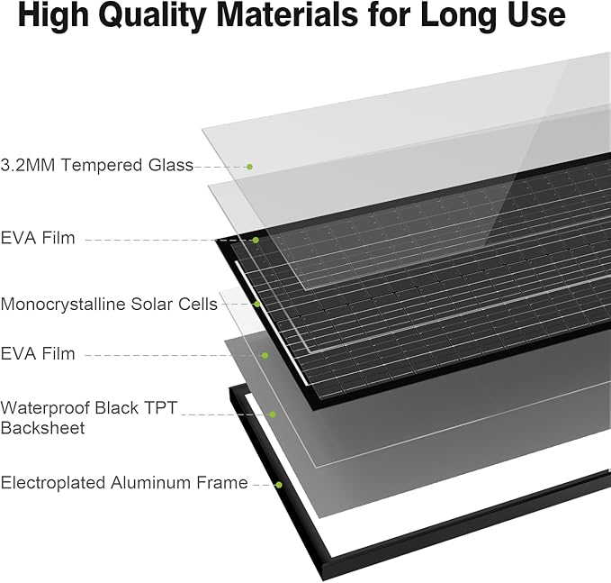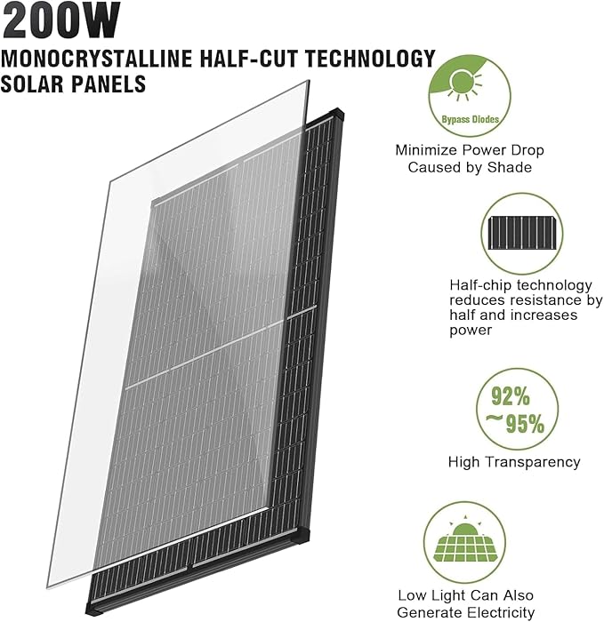 - Upgraded Design: 200W solar panel (1 Pack 200W) Single Panel, monocrystalline silicon solar panel adopts the latest half-cut cell technology, which divides the panel into two parts, and compared with ordinary solar panels, it can reduce the power loss by 4 times, increase the output power by 1.5%, and have the highest conversion of 25%.