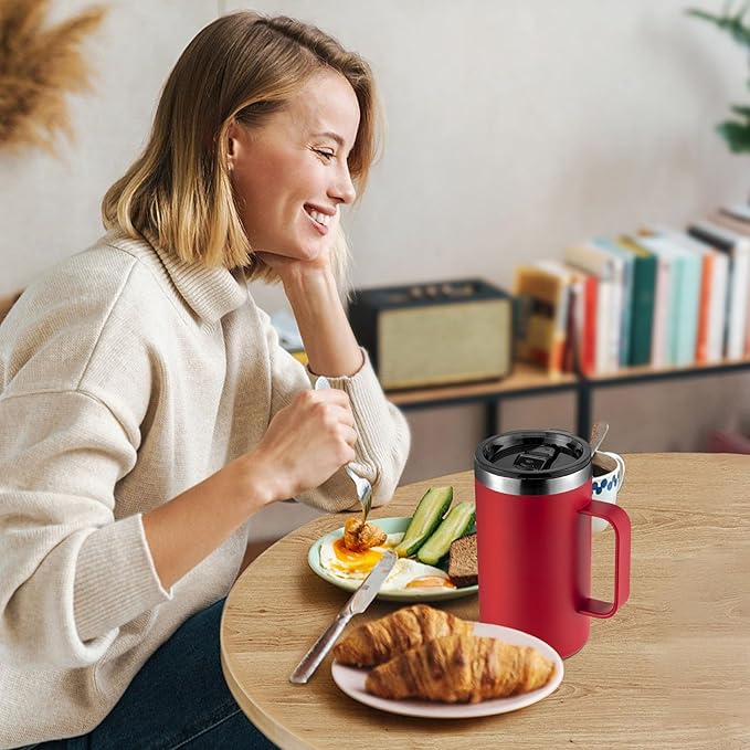 - INSULATED COFFEE MUG WITH HANDLE: 20oz coffee cup is large enough for heavy coffee lover at work, and also can be in beer gardens, home brews and the party. Insulated coffee mug with lid designed to keep your favorite hot, cold and carbonated beverages at the perfect temperature on the go.