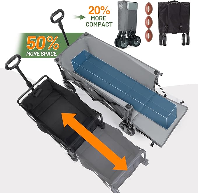 - LONGER & SPACIOUS: Our collapsible folding wagon measures 49 "L x 18.9 "W x 21.5 "H. With a maximum storage capacity of 250L/8.83 cu.ft, there is 50% more storage space than in other carts of the same size. It can not only easily accommodate longer items such as 10X10 pop-up tents, but is also dog and pet friendly, making it easy for them to enter and exit