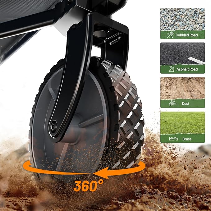 - BEARING BRAKES: Equipped with a state-of-the-art 360° rotating front wheel and precision-bearing brakes, this wagon outperforms standard foot brakes in both stopping power and control. Effortlessly navigate trails and park securely on inclines – the ultimate choice for savvy Amazon campers who prioritize safety without sacrificing convenience