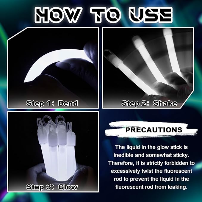 • Please Note: the liquid in the bulk glow sticks is not edible and has an adhesion; If it leaks, it is easy to pollute furniture, floors, clothing, skin, etc.; If the above situation occurs, be sure to clean it in time; If the fluid from the glow stick gets into your eyes, rinse with water or seek medical attention