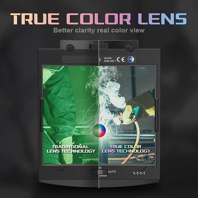 - Super Large Viewing Screen: The 4.31" x 3.82" (16.4 square inch) and side screens (no auto-darkening), combined with exceptional 1/1/1/1 Optical Clarity, guarantees a crystal-clear view, depicting true color views with cinematic quality. Weld with confidence as if you were watching a picture in a movie theater.