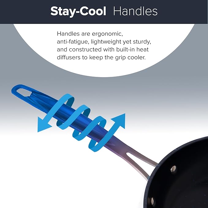 - ERGONOMIC STAY-COOL SS HANDLES – One of the most important parts of any cookware is the handle. The handles are stainless steel, ergonomic, anti-fatigue, lightweight yet sturdy, and with heat diffuser built in to keep the grips reasonably cooler longer.