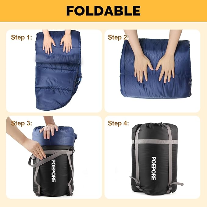 - More Spacious: POEPORE sleeping bag has dimensions of (78.74+11.81)*35.43 inches and a packed size of 16.53*13.38*5.51 inches. The sleeping bag features an enlarged and widened design, providing ample space that suits various body types, including even XXL sizes, allowing freedom of movement and ensuring comfort.
