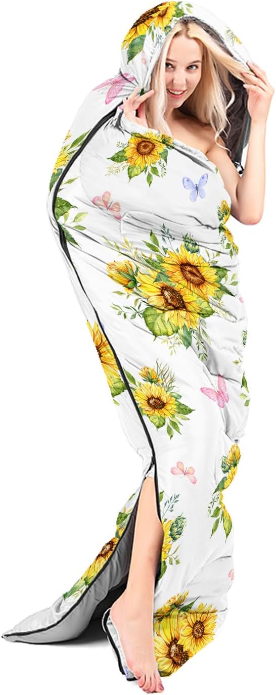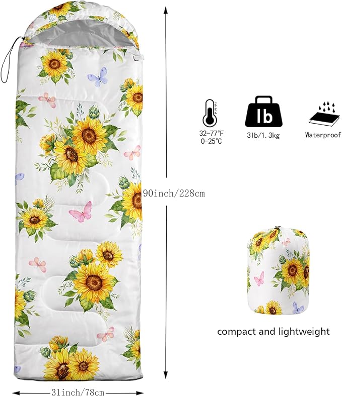 - Sunflower Great For All Seasons- Our camping sleeping bags are designed to give you a good night's sleep. Ideal for spring,summer,fall,and winter,rated from 32°F to 77°F (optimal comfort temperature is 50°F to 65°F). Stay comfortable and warm in any condition at normal altitude. Can be used for any outdoor adventure,class camping,summer camps,couch surfing,indoor blanket,and as an emergency blanket for vehicles.