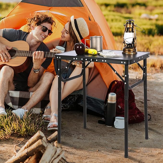- Compact & Stable: U-shape side support and secure latch ensure the aluminum camping table sturdy enough. MDF top+thicker aluminum alloy frame. Pack size is L16”xW12”xH3” when folded in half. Weighs only 4.8 lbs. Easy to fold and transport.