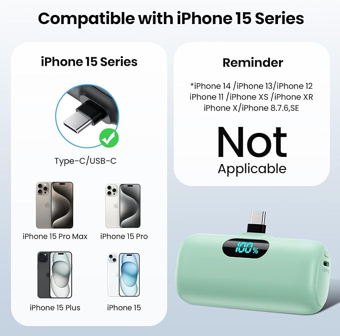 - Special Feature : Mini Power Bank Compatible With iPhone 15/15 Plus/15 Pro/15 Pro Max ,Mini size, Lightweight, Cordless Portable, Lipstick Size, Slim, Pocket Size,15W PD quick Charge , Airline Approved Safest Cell Phone Charger Power bank,Airline Approved Safety Travel USB-C Charger Mini Power Bank Compatible With iPhone 15/15 Plus/15 Pro/15 Pro Max ,Mini size, Lightweight, Cordless Portable, Lipstick Size, Slim, Pocket Size,15W PD quick Charge , Airline Approved Safest Cell Phone Charger… See more