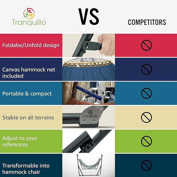 - PATENTED INNOVATIVE DESIGN: Proudly patented for its smart, tool- free setup in just 30 seconds, the Tranquillo Hammock with stand offers effortless outdoor relaxation. Easily adjustable for perfect comfort, built with durable materials for long-lasting use
