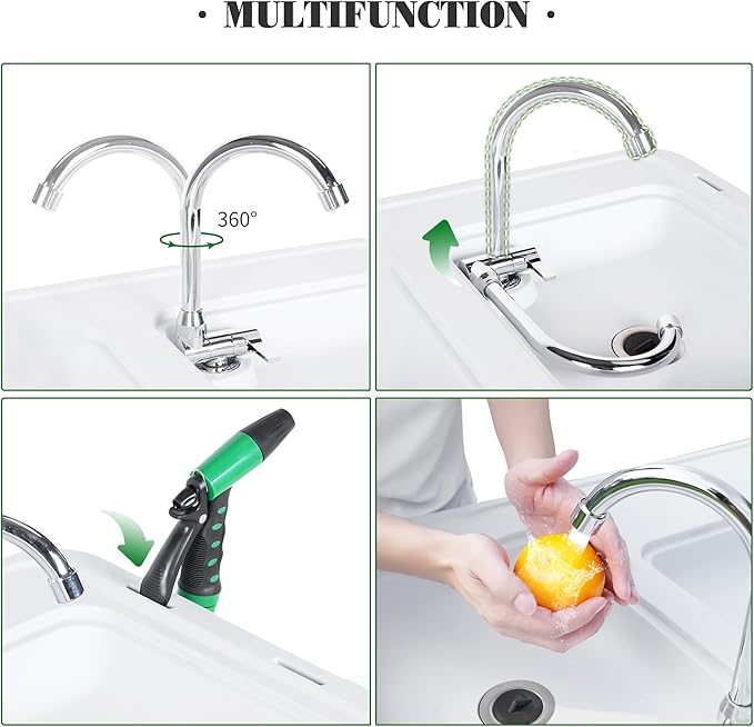 - 【More Features】-Double sinks with telescoping drainage hose for providing more space to wash. Equipped with 360° rotated folding faucet which could be foldable when no use, & extended water sprayer with three-way garden hose connector, which can be freely moved as you need, providing deep & thorough cleaning