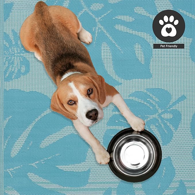 FH Home Outdoor Rug - Waterproof, Fade Resistant, Reversible - Premium Recycled Plastic - Tropical, Botanical - Patio, Deck, Porch, Balcony - Hana Leaves - Blue Crease Free - 5 x 8 ft
