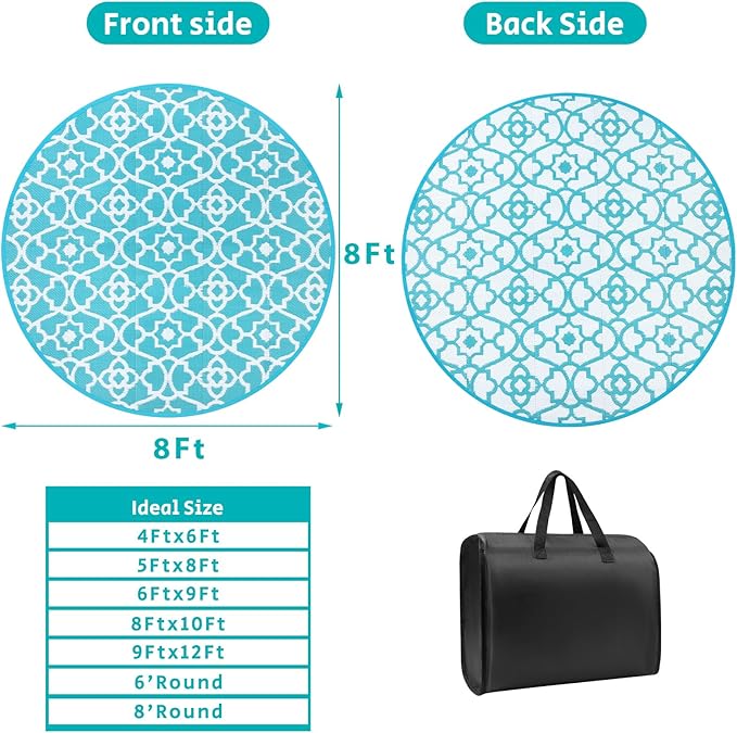 - Round Reversible Outdoor RV Mats 8Ft: The large 8 ft round outdoor porch rug with unique boho floral design, which makes it easy to use on patio,camper, deck, beach, backyard. And this outside camping rug is reversible, two-sided design allows you to have two different looks.