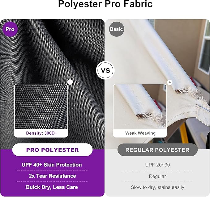 - Premium Polyester Pro Canopy: Features 2X tear-resistant fabric with 3 years fade resistance, quick-drying and easy to clean. Withstands sun, rain and wind while resisting wrinkles and shrinkage for lasting durability.
