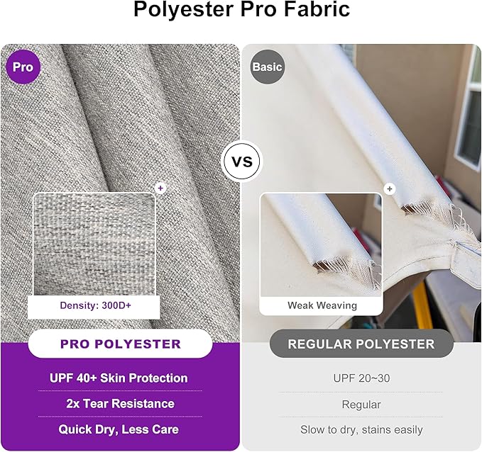 - Premium Polyester Pro Canopy: Features 2X tear-resistant fabric with 3 years fade resistance, quick-drying and easy to clean. Withstands sun, rain and wind while resisting wrinkles and shrinkage for lasting durability.