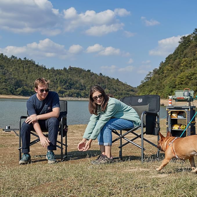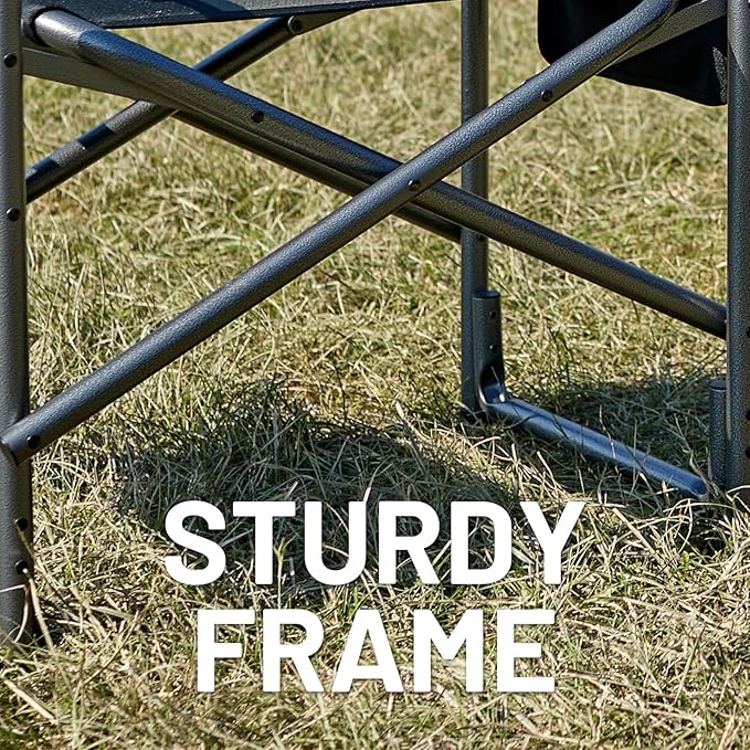 - CONVENIENT & COMFORTABLE FEATURES: The folding director's chair comes with a side table to keep belongings within reach; padded fabric and hard armrests provide extra comfort and relaxation.