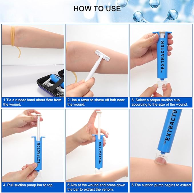 - Venom Extractor First Aid Tool Kit : this snake bite kit includes an extractor pump, 4pcs suction cups, a rubber band, a first aid mask, 2pcs alcohol pads, 2pcs bandages, a razor, an extractor instruction. The first aid kit can help you deal with outdoor snakes and bug bites, so that you can clean the wound in time to get the best rescue time.