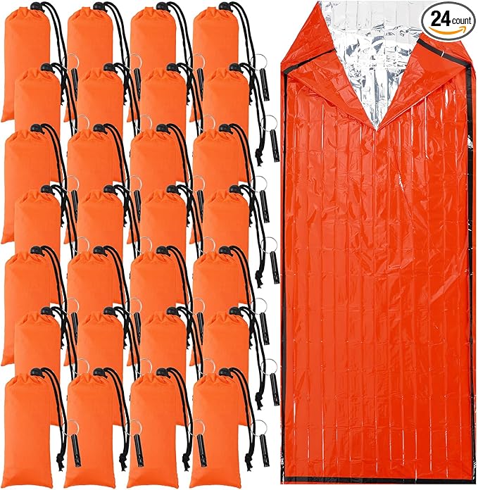 - Emergency and Survival Set: our survival kit features 24 emergency sleeping bags, 24 ripstop nylon bivvy stuff sacks, and 24 whistles for emergency uses; Whether you're hiking, camping, or stranded, safety is always a whistle away; Abundant packing can be shared with your friend, family, and team members as a gift