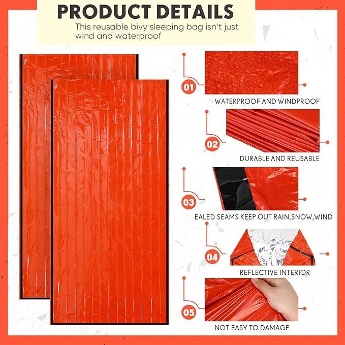 - Designed for Seasons: crafted of durable insulating aluminum and foil material, our waterproof sleeping bag preserves against rain, wind, snow, and other severe weather, so you will feel safe and warm in most weather conditions; The bright orange exterior of the bivy sacks are distinctive hue ensures that you're quickly noticeable, potentially hastening rescue or aid when time is of the essence