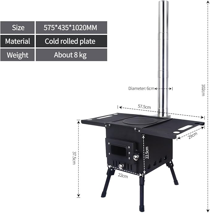 - The camping stove has a chimney pipe, which can effectively prevent smoke from escaping and ensure that the air is fresh and healthy. The stove is equipped with a carrying handle, which is convenient to carry and use.
