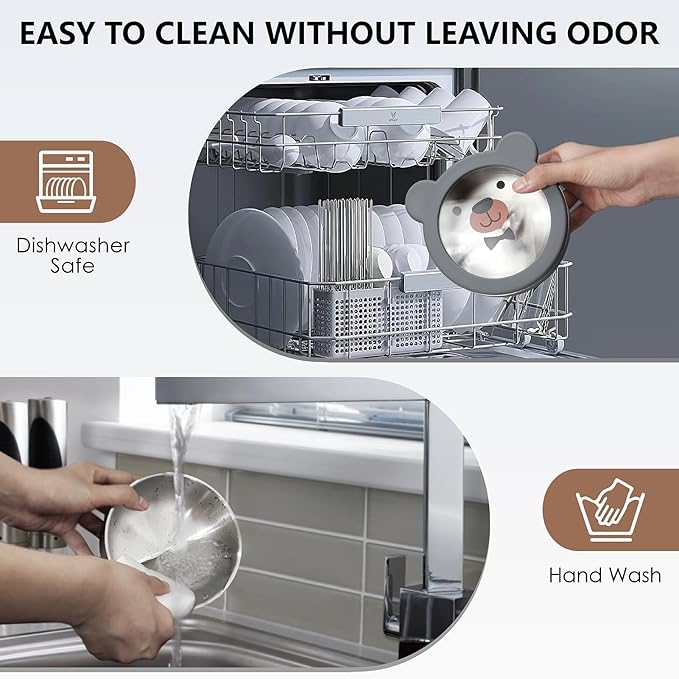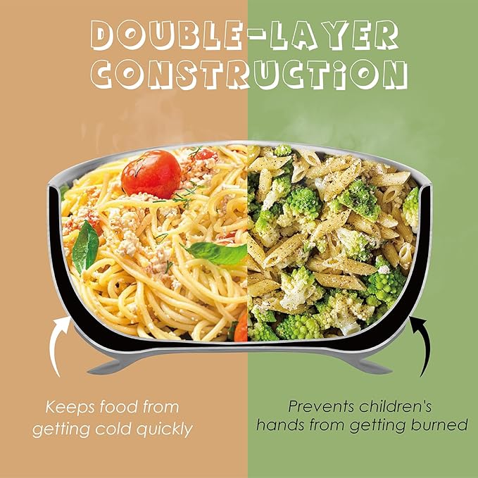 - This insulated baby bowl features a double-layer stainless steel construction that prevents heat transfer and keeps food warm while protecting baby's hands from scalding. Comes with an airtight lid made of tempered glass and silicone to keep leftovers fresh and you can feed your baby on the go. Our silicone baby feeding bowls are made for dishwasher safe and freezer safe, so just put the silicone suction bowls into the dishwasher after the meal.