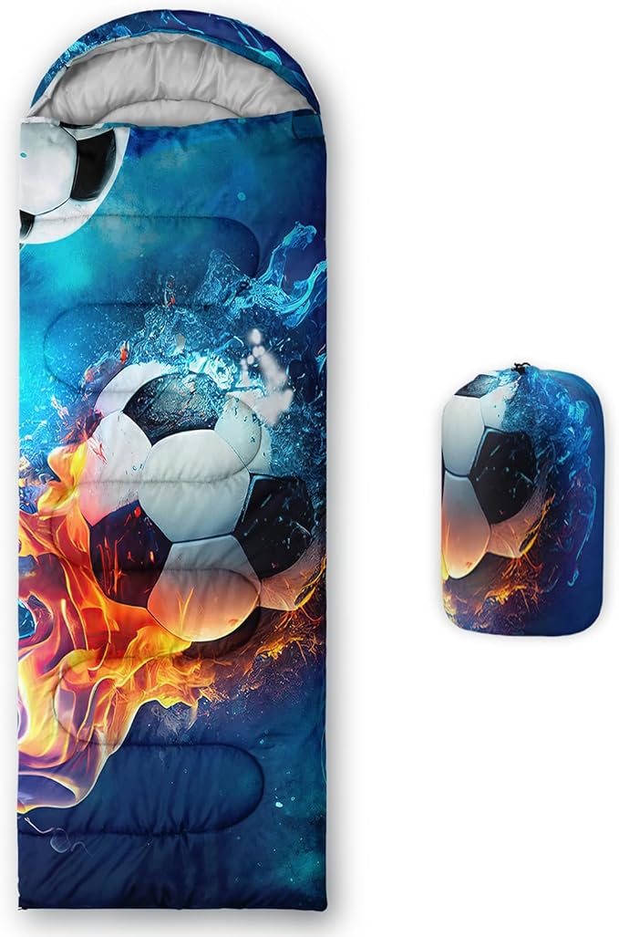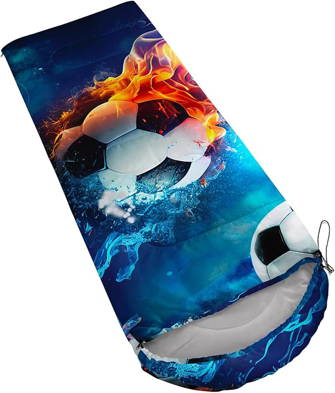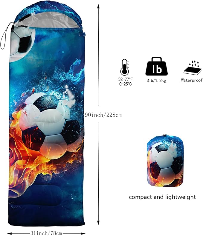 - 【Fits For 3 Seasons】: Size - 31 by 90 inches (W x D). Our Ice Fire Football sleeping bag can be used in 3 seasons with a design temperature of 32℉-77℉(0℃-25℃). These Ball Sports bags also have a weather resistant waterproof design to keep you warm and prevent you from any dampness.