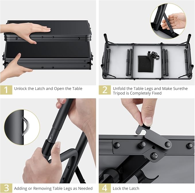 - High Quality Material, Sturdy and Durable: The entire frame of portable table is made of thicker aluminum alloy, which is very solid and durable. MDF (Medium Density Fiberboard) tabletop is smooth and easy to clean. You can easily remove stains by simply wiping with a damp paper towel