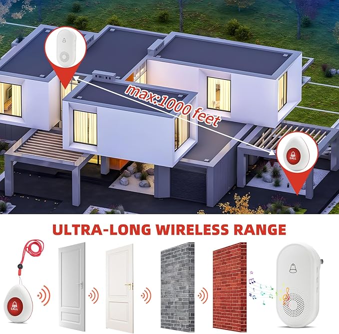 - Easy to use and carry:Ready to use out of the box without pairing. The receiver can be moved with caregivers to the bedroom, kitchen, bathroom, or yard. The call button can be conveniently hung around the neck with a hanging rope, or installed on the wall with double-sided tape or screws (the package includes hanging rope, double-sided tape, and screws). Support a 1000 ft operating range in open areas to ensure you don't miss any distress signals.