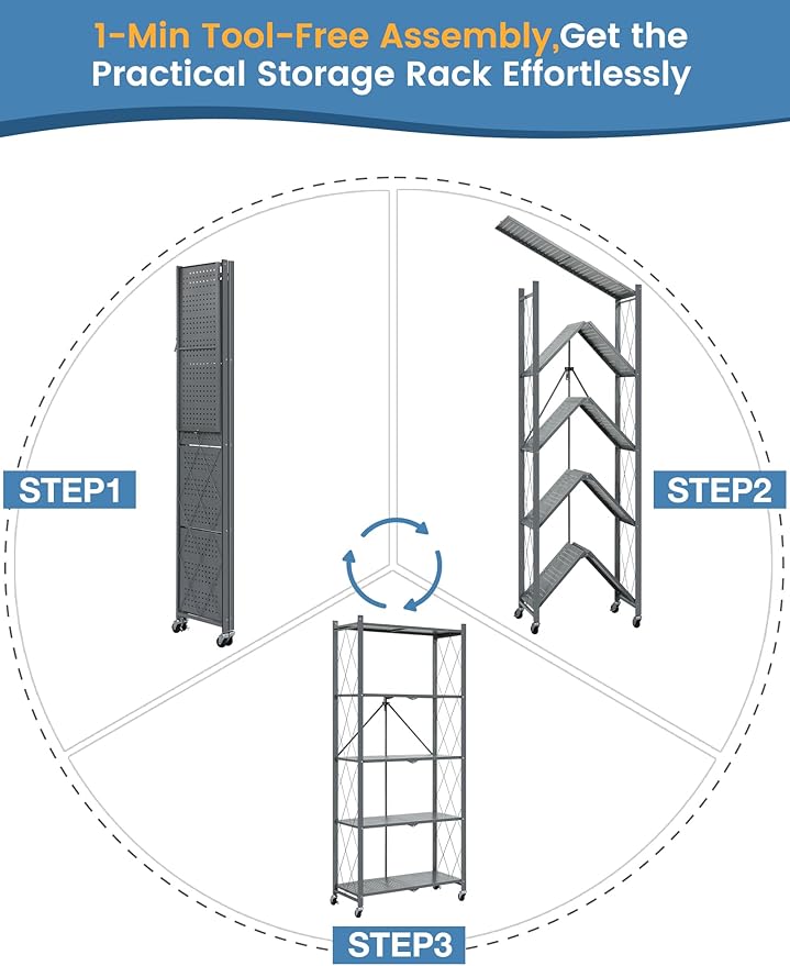 - [1-Min Tool-Free Assembly] No bolts, no tools, no frustration! Unfolds from 3.9-inch flat pack to 70.7" shelving in 60 seconds - 10x faster than traditional shelves. Perfect for last-minute garage cleanups, holiday guest prep, or emergency storm supplies organization.