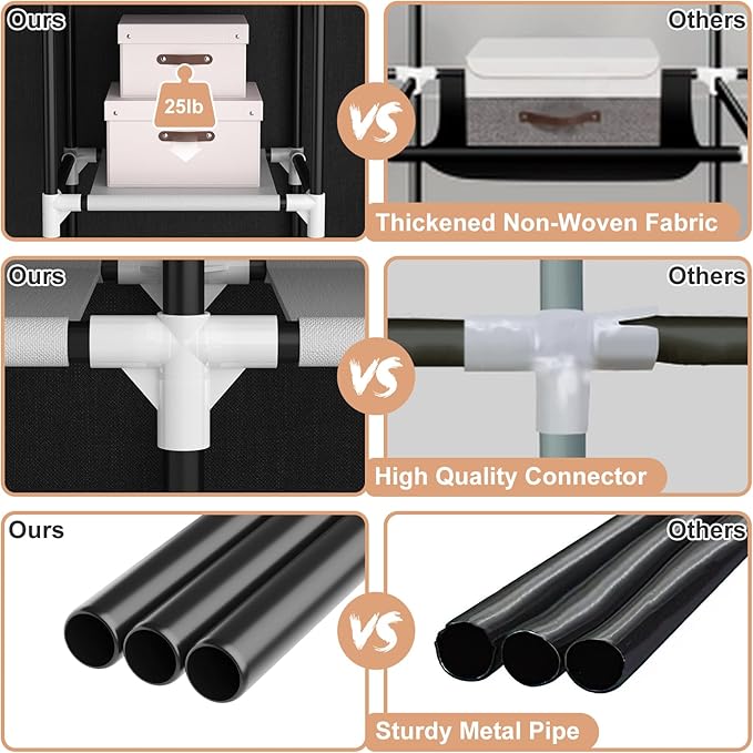 - [Easy to Assemble] The portable closet wardrobe is equipped with a detailed installation instruction manual, just follow the steps of the instruction manual to assemble, and it can be done easily. In addition, we have made an installation video on the page for your reference to help you install faster. NOTE: Make sure all the rods reach the bottom of the plastic connector holes.