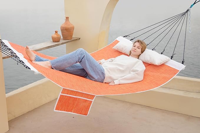 - ✅WATERPROOF & DURABLE TEXTILENE FABRIC: Weather-resistant hammock is made of Textilene, which is Quick-drying, non-fading, breathable, comfortable, durable, easy to clean and quick drying. It can greatly reduce your daily maintenance costs.