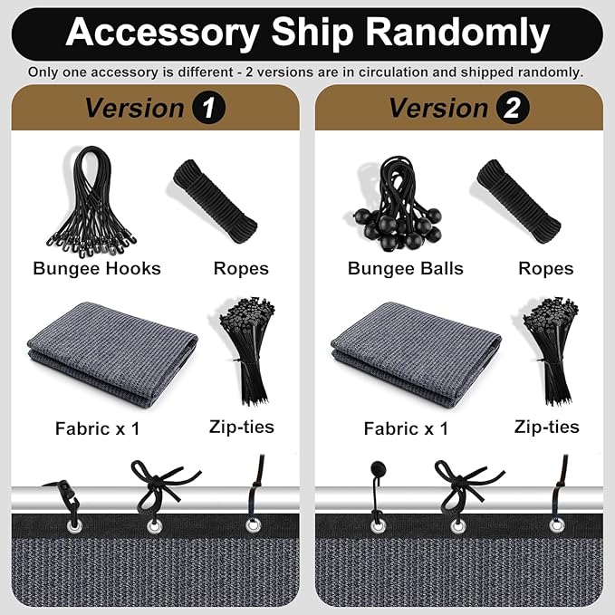 - Accessory Updated: Accessories have been updated from [Zip-ties, Ropes, Bungee Balls] to [Zip-ties, Ropes, Bungee Hooks]. Both versions are in circulation and will be shipped randomly. Versatile Use: Perfect for outdoor spaces like patios, lawns, gardens, and pergolas. Additionally, it serves as an effective privacy screen, windbreak, plant cover, and finds applications in greenhouses, coops, kennels.