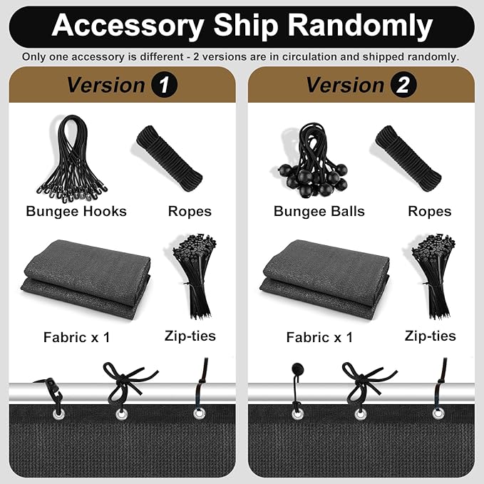 - Accessory Updated: Accessories have been updated from [Zip-ties, Ropes, Bungee Balls] to [Zip-ties, Ropes, Bungee Hooks]. Both versions are in circulation and will be shipped randomly. Versatile Use: Perfect for outdoor spaces like patios, lawns, gardens, and pergolas. Additionally, it serves as an effective privacy screen, windbreak, plant cover, and finds applications in greenhouses, coops, kennels.