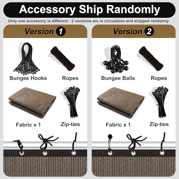 - Accessory Updated: Accessories have been updated from [Zip-ties, Ropes, Bungee Balls] to [Zip-ties, Ropes, Bungee Hooks]. Both versions are in circulation and will be shipped randomly. Versatile Use: Perfect for outdoor spaces like patios, lawns, gardens, and pergolas. Additionally, it serves as an effective privacy screen, windbreak, plant cover, and finds applications in greenhouses, coops, kennels.