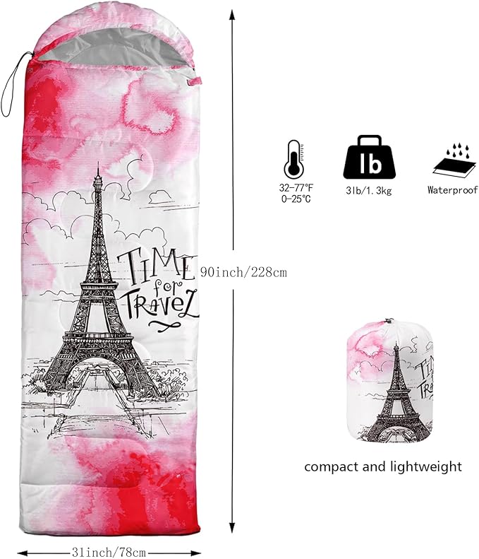 - 【Fits For 3 Seasons】: Size - 31 by 90 inches (W x D). Our Paris Architecture sleeping bag can be used in 3 seasons with a design temperature of 32℉-77℉(0℃-25℃). These Sleeping bags also have a weather resistant waterproof design to keep you warm and prevent you from any dampness.