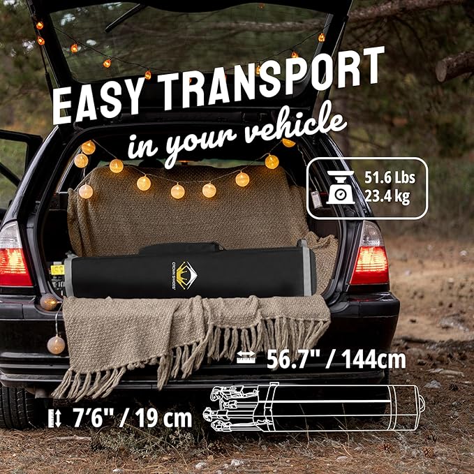 - SPACIOUS AND COMPACT - With a 12' x 12' canopy footprint, this tent provides 144 square feet of shade, accommodating up to a dozen people comfortably. The interior height exceeds 9’4”, and the maximum clearance under the valance is over 6’3”. When packed, the dimensions are 56.7” x 8” x 8”, fitting perfectly in your vehicle’s trunk. The headroom is enhanced by the absence of overhead crossbars, offering more spaciousness compared to traditional designs, making it great for outdoor parties.